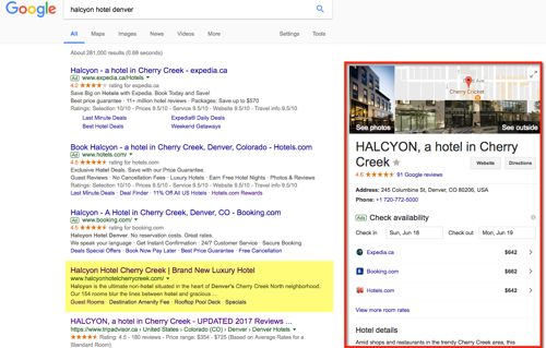 Σε ένα άρθρο του με τίτλο «Is Organic Search Dead for Hotels?», ο Frederick Gonzalo αναλύει τα αποτελέσματα μιας αναζήτησης στο Google για ένα ξενοδοχείο, τα οποία φαίνονται παρακάτω.