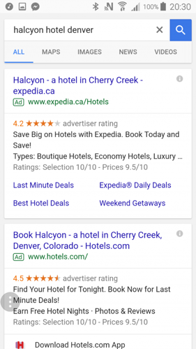 Όλες οι παραπάνω εικόνες δείχνουν τον τρόπο εμφάνισης αποτελεσμάτων σε οθόνη υπολογιστή. Όμως, το βασικό στοιχείο που λείπει είναι τα αποτελέσματα αναζητήσεων σε οθόνες κινητών τηλεφώνων, οι οποίες φτάνουν το 50-60% για τα ξενοδοχεία. Στην επόμενη εικόνα εμφανίζονται τα αποτελέσματα αναζήτησης σε κινητό.