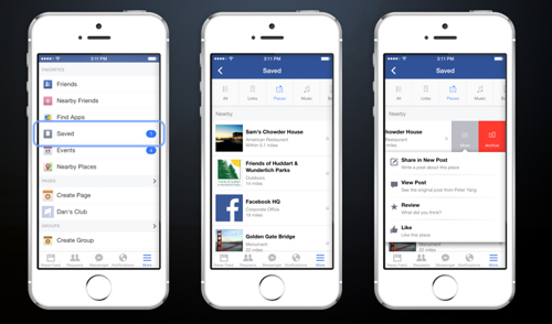 Τo Facebook θα σου επιτρέπει, από όλες τις συσκευές, με ένα κλικ, να κάνεις μία ανάρτηση "save for later" . Επιπλέον θα υπάρχει και η δυνατότητα στους publishers να κάνουν embed σε web pages ένα κουμπί "Save to Facebook", το οποίο θα επιτρέπει σε χρήστες να σώζουν άρθρα στο Facebook χωρίς να το έχουν ανοιχτό. Όλες οι "Saved" αναρτήσεις/σελίδες θα είναι συγκεντρωμένες σε ένα tab στο προφίλ τους.