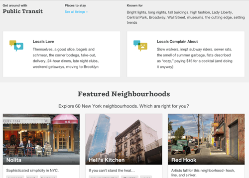 Δείτε αυτό το παράδειγμα για τη Νέα Υόρκη. Τα υπέρ και τα κατά των ντόπιων, και η 'known for' πληροφόρηση δίνει στους χρήστες μια γρήγορη ιδέα για την πόλη, πριν ψάξει και βρει ποια γειτονιά του ταιριάζει.